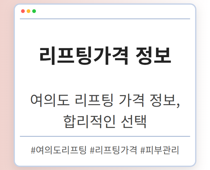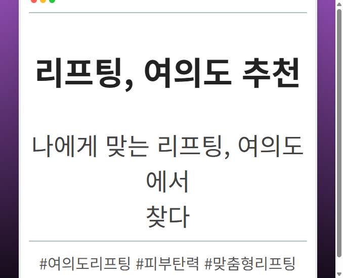 목차 여의도 리프팅, 왜특별할까요? 나만을 위한 맞춤 리프팅, 가능할까? 여의도 리프팅, 어떤 종류가 있을까? 합리적인 선택, 여의도 리프팅 가격 비교