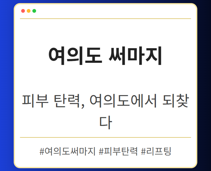 목차 여의도 써마지, 왜 선택해야 할까? 써마지 효과, 얼마나 지속될까? 정품 팁 사용, 왜 중요할까? 합리적인 여의도 써마지 가격, 어떻게